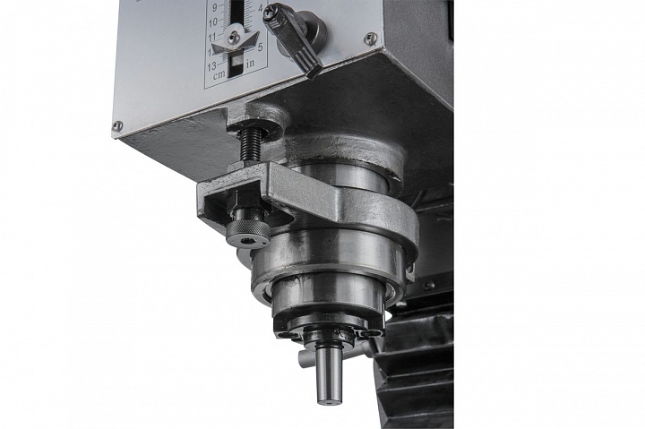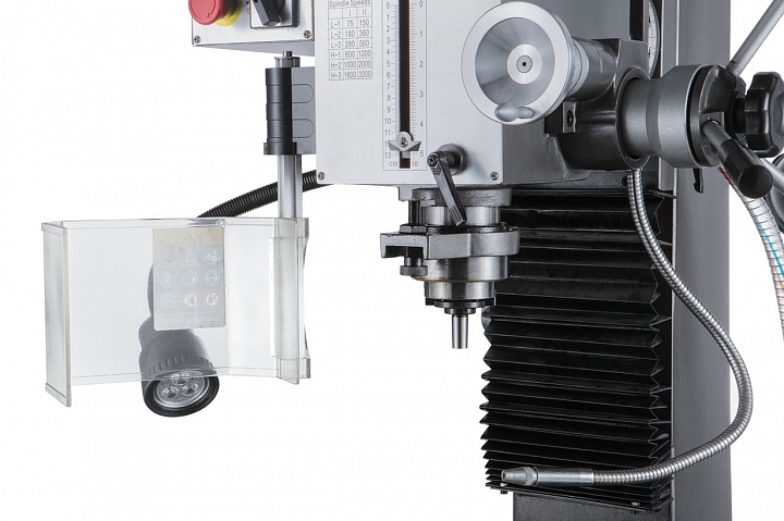 Фрезерно-сверлильный станок этой модели имеет конструкцию, рассчитанную на выполнение большого объема работы по обработке заготовок. Станок оснащен шпинделем с конусом ISO30 с зажимной тягой М12. Ход пиноли шпинделя составляет 120 мм. Станок обеспечивает нормальную работу с режущими инструментами, максимальный диаметр которых составляет при сверлении стали до 32 мм и чугуна до диаметра 45мм, при фрезеровании концевой фрезой до 32мм и торцевой фрезой до 80 мм. Оборудование позволяет осуществлять вращение шпинделя в обоих направлениях, вправо и влево. Наличие микрометрической подачи, позволяет установить инструмент на необходимую глубину в ручном режиме. Максимальный вылет пиноли шпинделя составляет 120 мм.