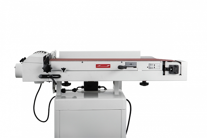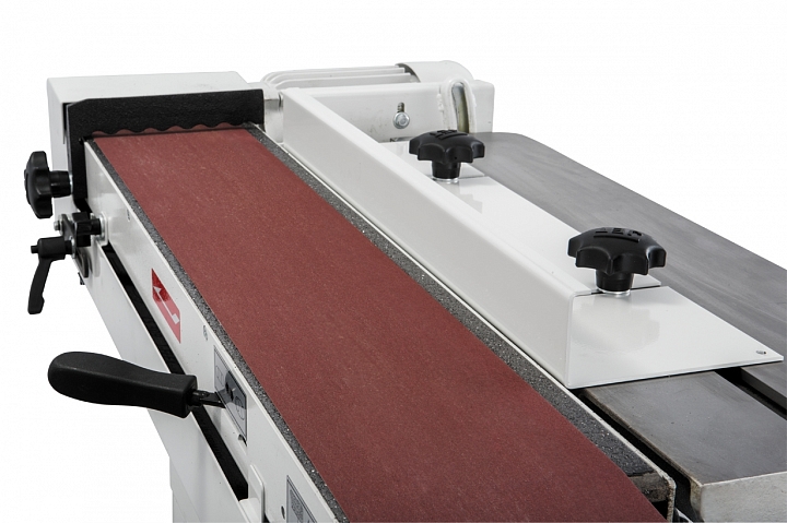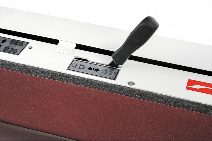 Модель оснащена вспомогательным механизмом, который за счет поворота узла переднего натяжного ролика обеспечивает колебания ленты в направлении перпендикулярном основному движению. Осцилляция способствует более эффективной работе абразива и повышает производительность станка.