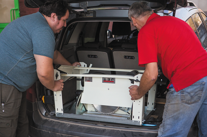 Для облегчения транспортировки опорные ноги складываются примерно на половине высоты, благодаря чему станок легко помещается в багажник легкового автомобиля. Перемещать инструмент по площадке легко в одиночку: колеса, откидные рукоятки и небольшой вес это позволяют. При работе в мастерской или в помещении можно воспользоваться системой аспирации, которая собирает опилки и сверху, и снизу пильного диска, после чего они удаляются системой аспирации через единый 100-миллиметровый патрубок.
